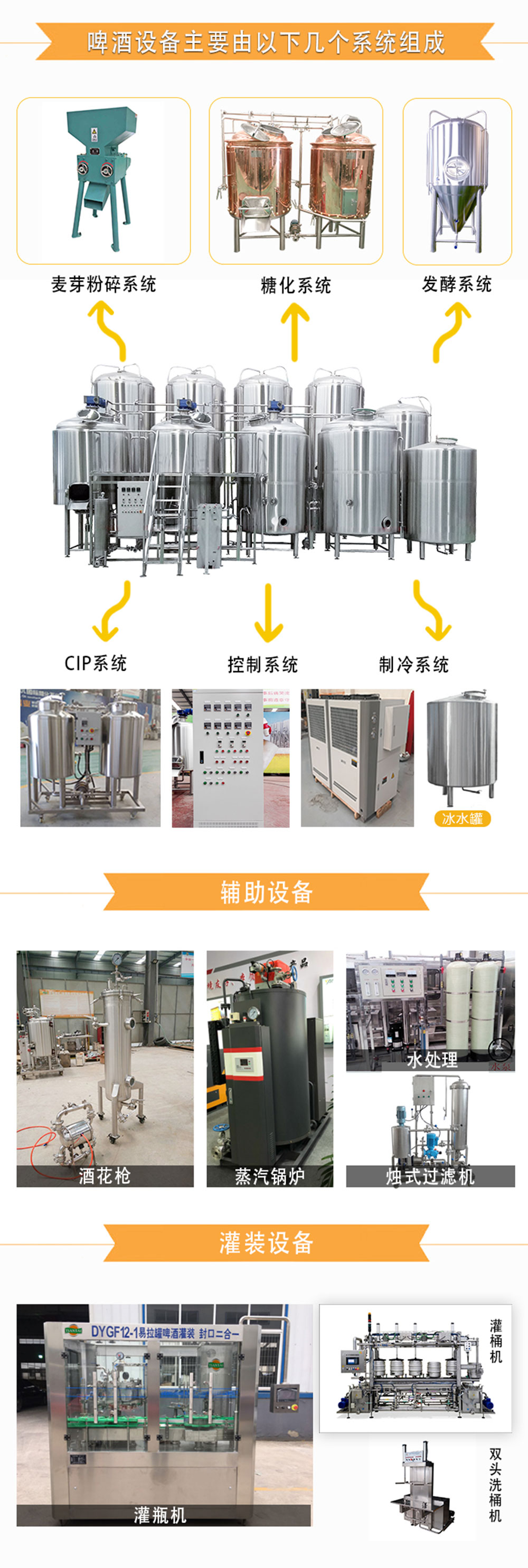 啤酒釀造設備一般分為:1、麥芽粉碎系統。2、糖化系統。3、發酵清酒系統。4、制冷系統。5、CIP清洗系統。6、控制系統,7、灌裝設備,8、蒸汽、空壓等其他輔助系統。